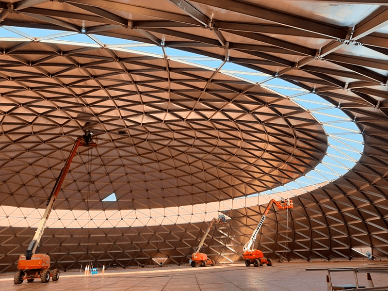 Os Tetos Domo Geodésicos são projetados para uma instalação eficiente, com diferentes metodologias de montagem conforme o diâmetro e as condições do local.